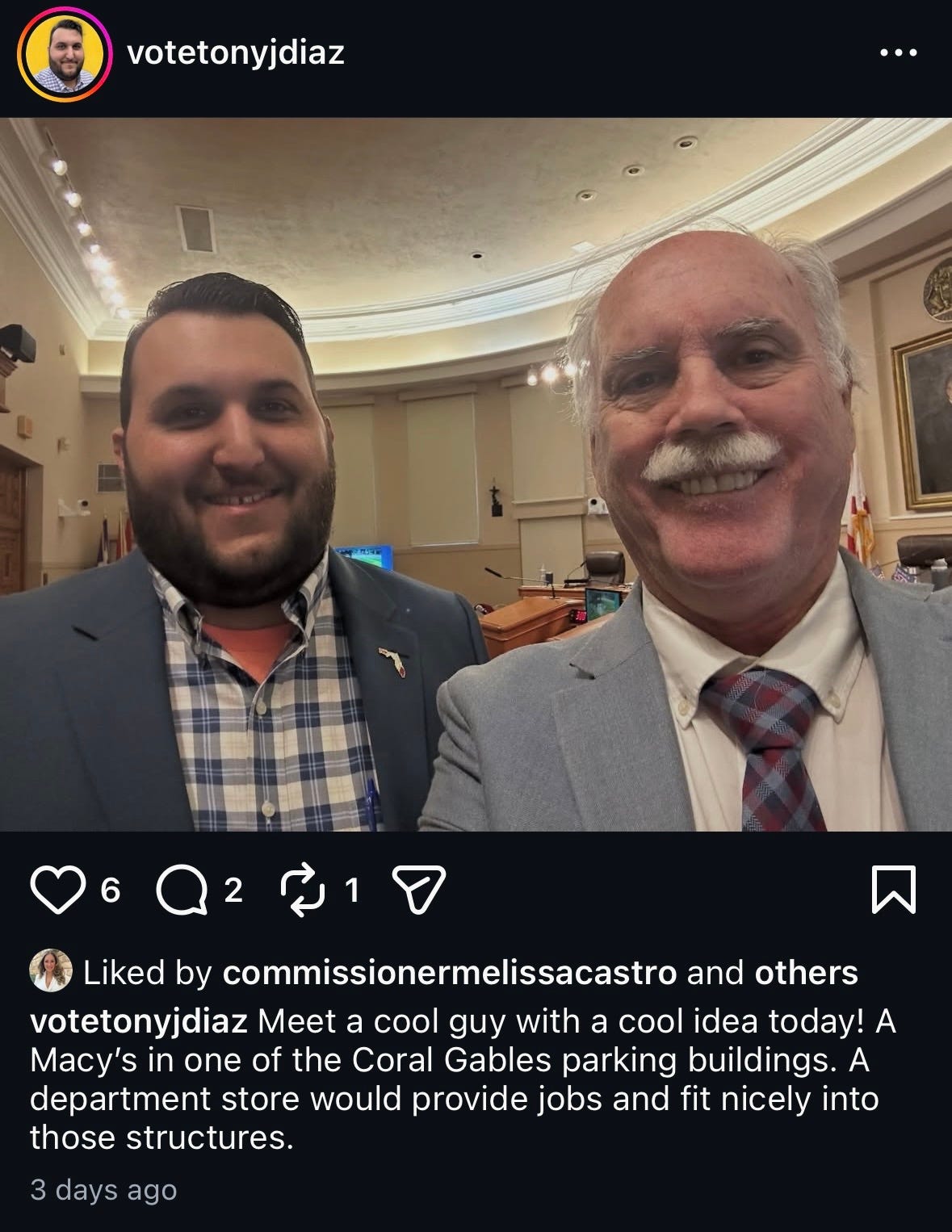Anyway, she arranged for a gentleman named Tony Diaz, who apparently is running for state representative in a district beyond the Gables, to speak in support of her resolution during public comment. Everything seemed fine until shortly after the meeting Mr. Diaz decided to post an Instagram reel accusing Lago of “attacking him multiple times” and then declaring, because he’s so real™ and relatable™, that “all Lagos are pieces of shit.” See for yourself: