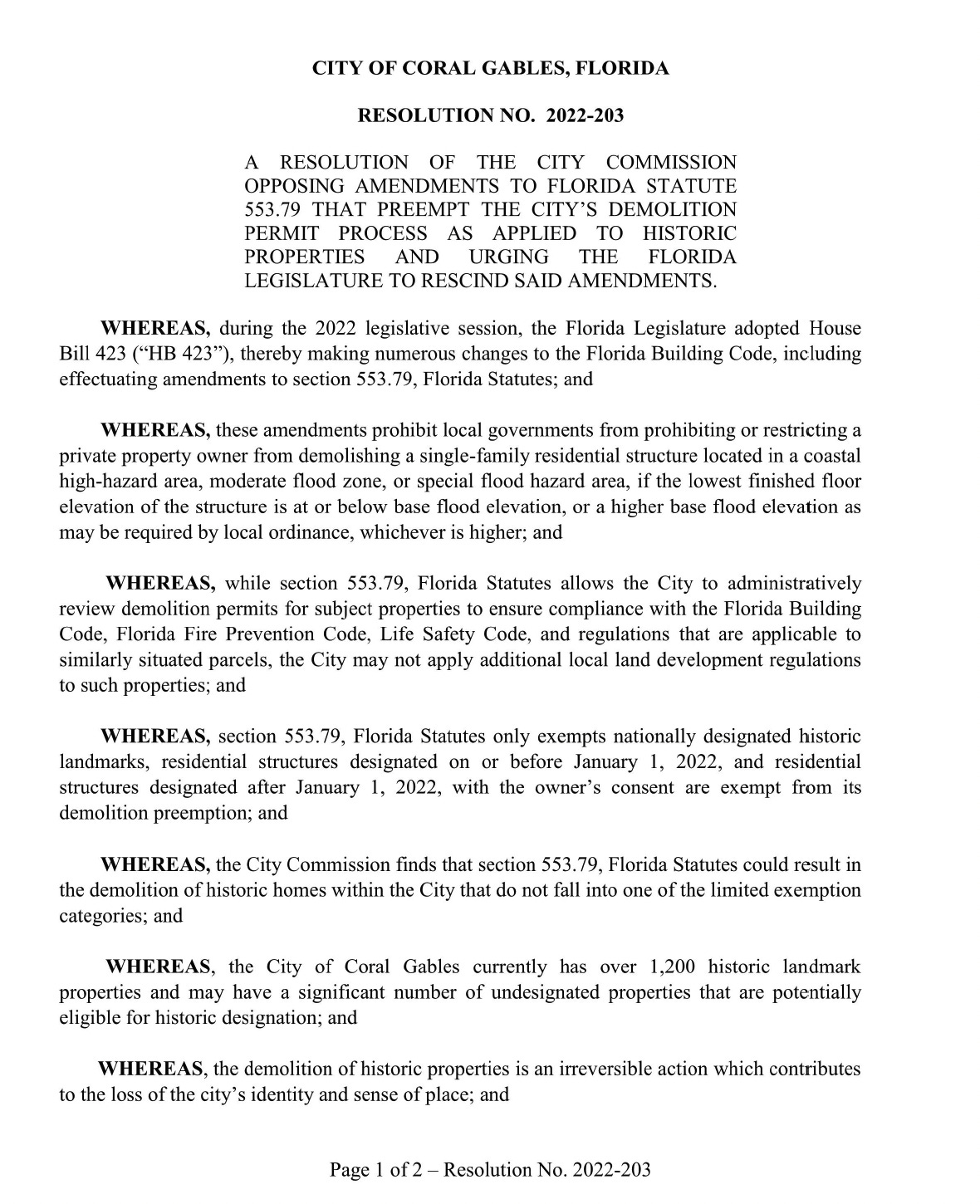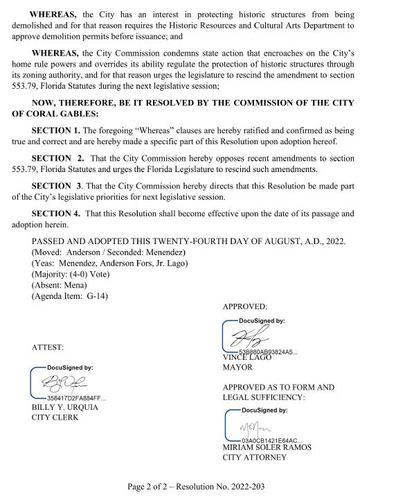 There was the vote to urge the state to rescind its preemption of local historic preservation ordinances so that the Gables can save the Alfred Browning Parker home in Gables Estates. Like a lot of what Ariel does, this was purely symbolic. How do I know? Because two elected officials not named Ariel Fernandez actually got off their asses and flew to Tallahassee long ago to fight the state legislature on this very matter and were told to pound sand. They also passed their own resolution opposing the state’s preemption. But I guess that’s not something an “insider” would remember.