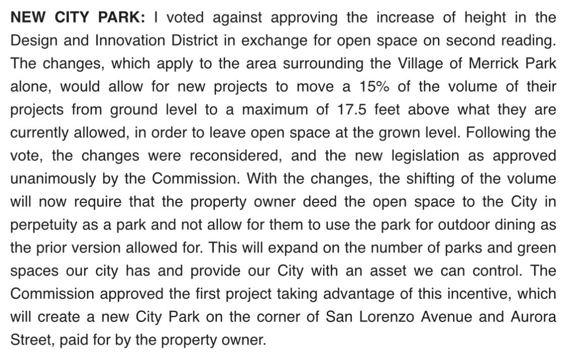 Last Tuesday’s commission meeting wasn’t all bad. It had its moments. The above-mentioned height-for-open-space swap was eminently sensible, although if you rely exclusively on Ariel’s self-reporting you’ll likely come away a bit confused as to what actually happened. That’s because while he’s not the most gifted communicator in general, he has this funny way of becoming a syntactical contortionist when he’s spinning for himself. Take his Commission Insider—ugh, I feel so cheesy typing those words—recap on this item: