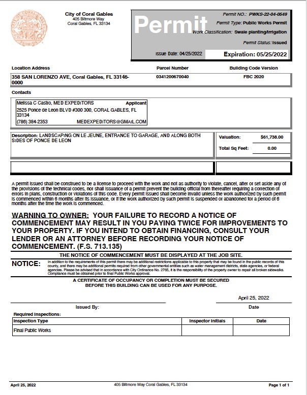 Regarding that last part, I bet most of you didn’t know that the Shops at Merrick Park (the mall) is one of the many Gables-based clients that Dr. Castro’s business serves, I bet you didn’t know that Dr. Castro herself has pulled permits for them, and I’ll bet you didn’t know that Dr. Castro recently voted “yes” on a shared-parking arrangement that is apt to result in the mall receiving a substantial amount of new parking revenue.