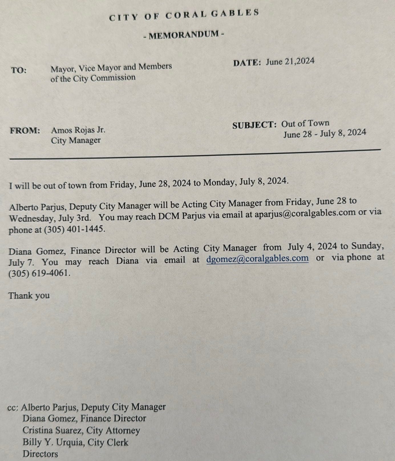 As you will see below, your new city manager, the one who came out of retirement less than five months ago, decided to take a little time off recently: